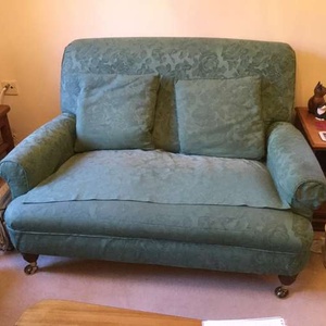 A Multiyork sofa about 21 years old. It has a fire safety certificate. The cover is removable for dry cleaning. HxWxD about 36x50x37 inches. There is a tear in the fabric of the seat which is covered by loose matching fabric. With matching cushions. There are also two matching armchairs available, see another entry. At RG40 1BX.