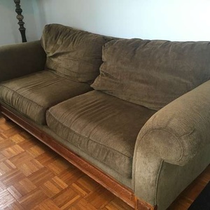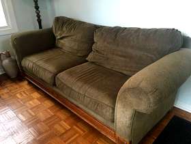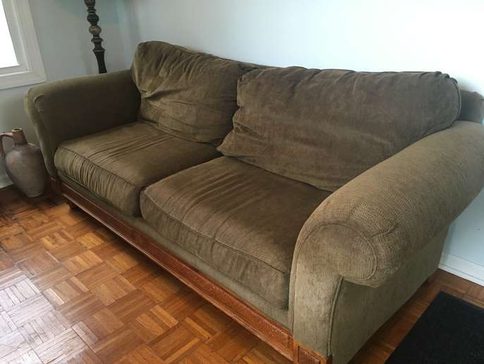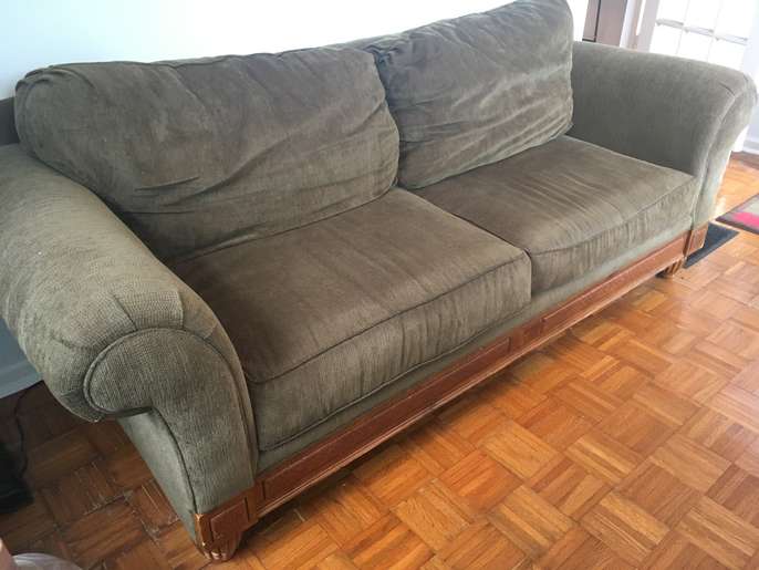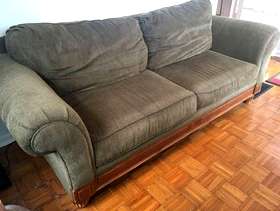 VERY comfy, good condition, olive green chenille upholstery, 90x38x36, must claim by Friday, 7/13.