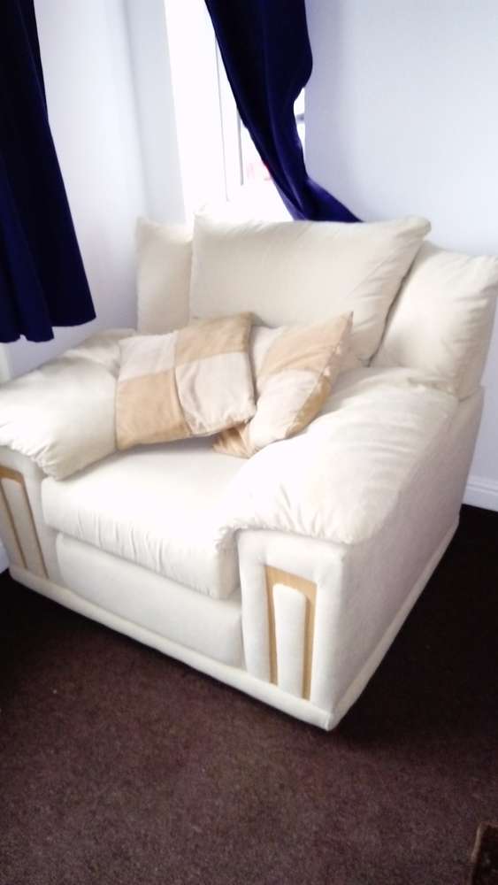 X1 two seater sofa that then folds out to a sofa bed with a matching armchair. Cream in colour. In used good condition. Few marks but still very comfortable. Must be gone by Wednesday night. Trowbridge collection only.