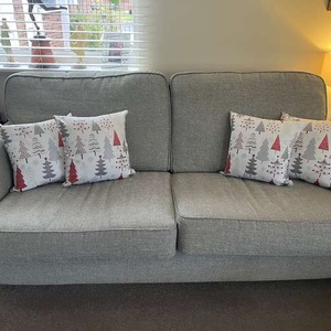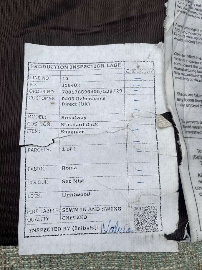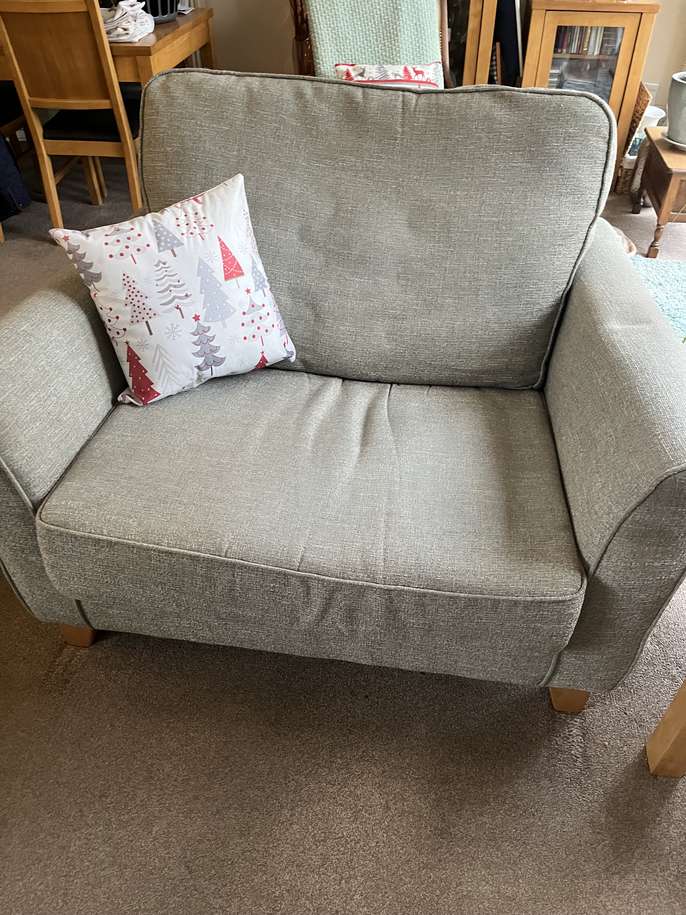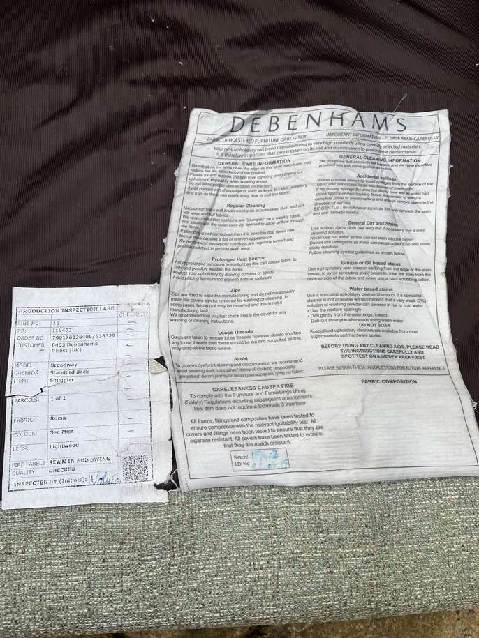 I am offering for free a large three seater sofa and large armchair (love seat) in good condition. Overall look/colour soft mint green. Sofa dimensions: width 192 cm, back height 92cm, seat height 42cm, depth 103cm. Armchair dimensions: width 103cm, all other dimensions same as sofa. Fire certificates still attached. Originally sourced from Debenhams. Scatter cushions in photos NOT INCLUDED Removable seat and back covers. Solid undamaged frame and springs. Pick up only. Van would be required due to size of furniture. Email with your genuine interest initially. The item is in Ifield not Gossops Green as advert suggests