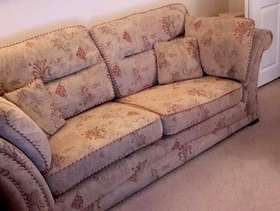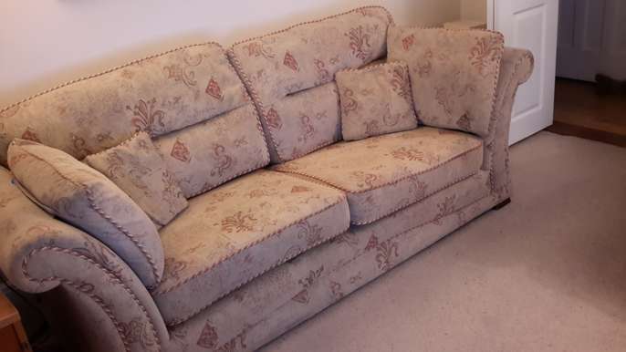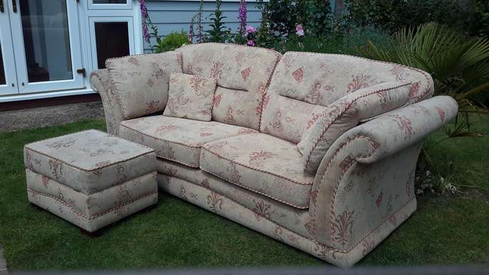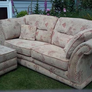 Two/three seat sofa fabric washable cushion covers. Good condition with current fire labels matching poof with storage