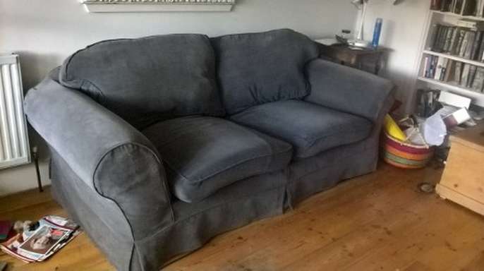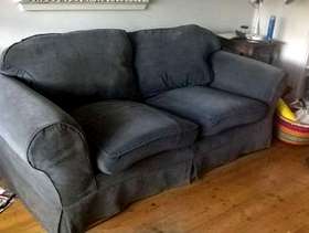 Attractive 3 seater sofa bed. Dark grey cover. Metal and wood frame, sprung mattress. Good condition but needs new seat cushion covers and possibly new loose cover. Approx 210cm wide x 97cm deep. Heavy item - 2 man job to lift.