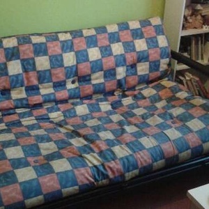Metal framed double sofabed. Black frame. Mattress is multi coloured one side and plain dark blue on the other. For collection only.