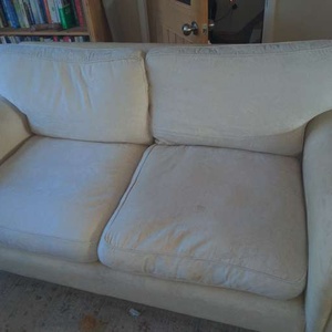 Cream cotton sofa, cushion cover washable. Small tear on one cushion but repairable, very comfortable. No smoking home with pets.