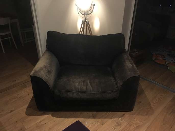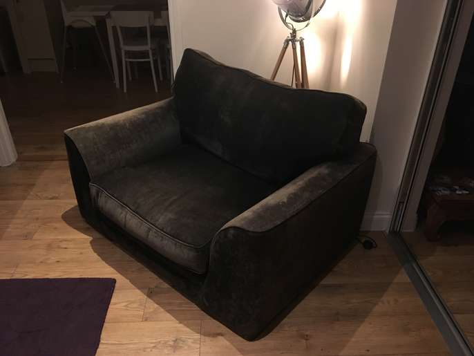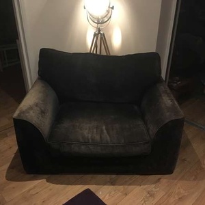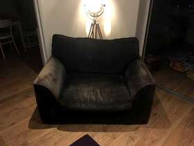 Black snuggle seat sofa Good condition but faded in places. Very comfy. 133cm wide 97cm deep 80cm high