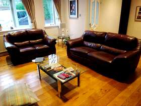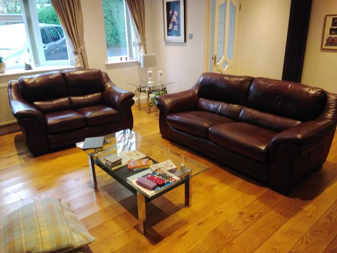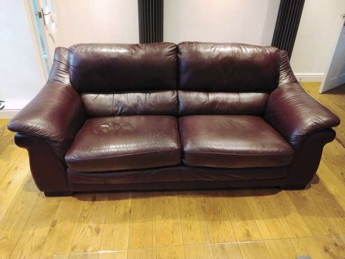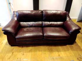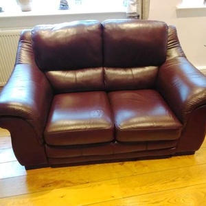 Leather 2 seater and 3 seater sofas in Ox-Blood red , reasonable condition. Unfortunately no fire labels.