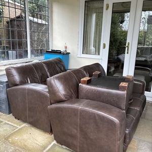 Two 2 seater leather sofas and poof in brown