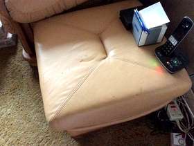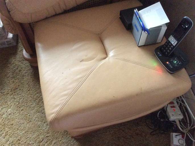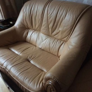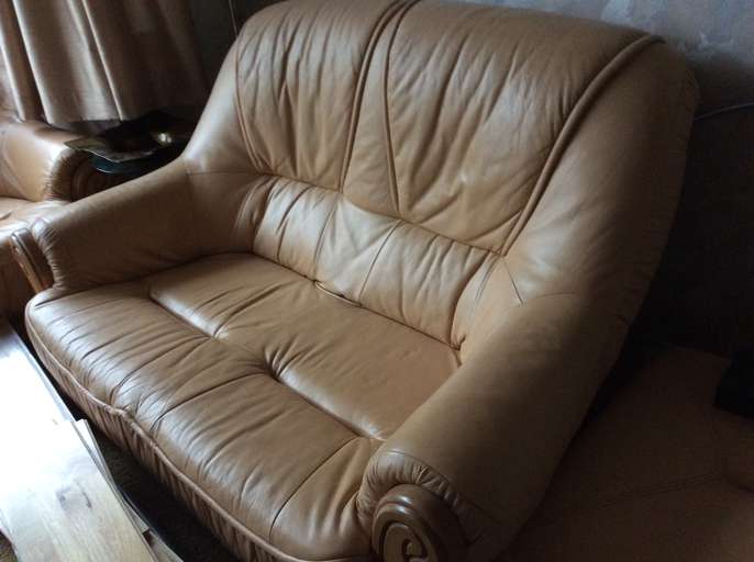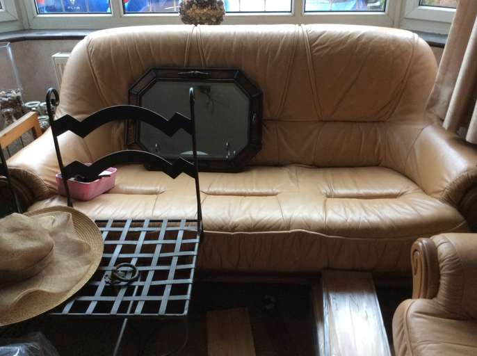Two and three seater sofas plus foot stall. Honey coloured leather. Good condition other than slight marking on one cushion.