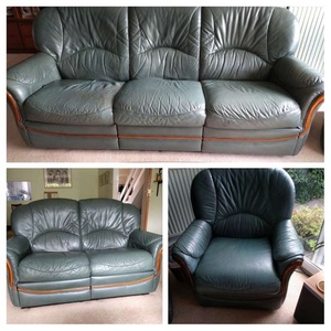 Dark green leather three seater sofa and two seater sofa plus armchair. Worn in a couple of places but still serviceable.