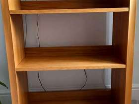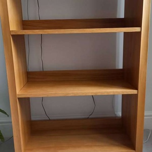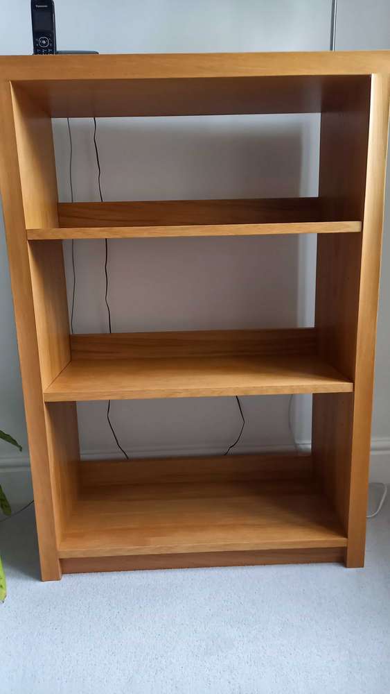 3 shelf, solid oak open bookcase - 70cm side, 30cm deep, 102.5cm tall. The veneer on the edges of the oak needs sticking down as it has curled slightly in the sunlight.