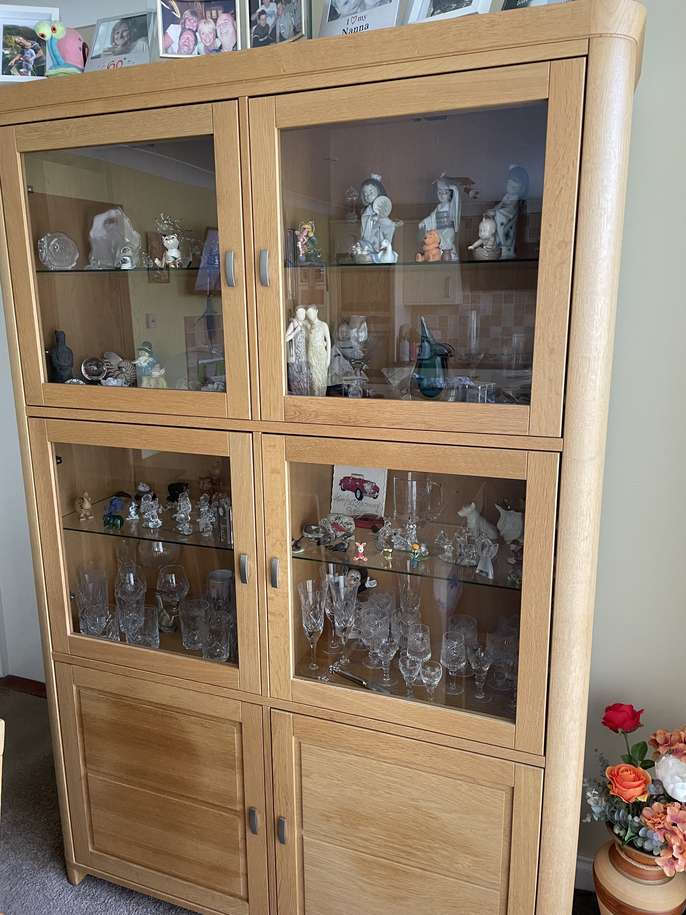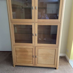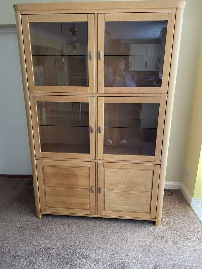 Looks like new Glass shelving with lights in ( working) Bottom section is two closed cupboards Free as need to get rid of quickly! Contact: Linda