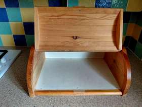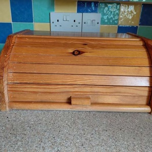 Solid pine bread bin available free for collection from Highcliffe BH23 5DT. Good condition, but with a few knocks and scratches here and there, consistent with age; front flap moves freely. Size W 42cm, D 29cm, H 18cm.