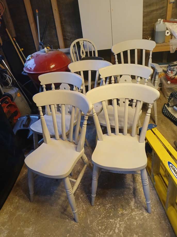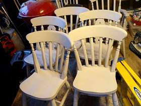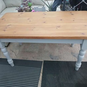Solid Pine table 0.75m x 1.5m, 6 solid pine chairs. items will need rubbing down and re-varnishing and/or painting.
