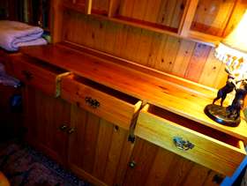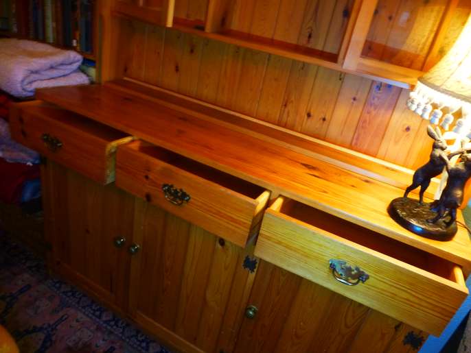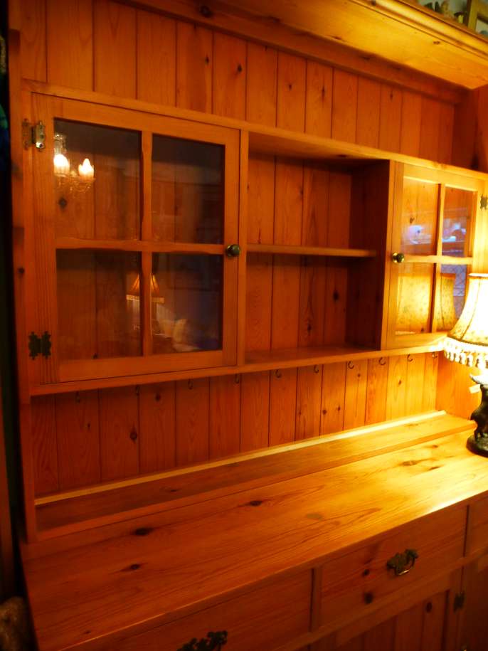 Beautiful & practical solid pine Welsh dresser with 2 leaded glass doors. In 2 pieces, base & top. Base has 3 drawers & 3 doors, with a shelf. Top has 2 shelves separated by 2 leaded glass doors with smaller shelves in the middle. Base unit - length - 136 cm / 53.5 " approx : Depth - 44.5cm / 17.5" approx : height - 84.5cm / 33.3" approx Top unit - Length - 136cm / 53.5" approx : Depth - 23.5cm / 9.5" , narrowing to 18cm /7" approx : height - 113cm / 44.5" approx Have had it many years & thanks to Freelywheely, we have a larger & older one now. It is ready to collect from TW13.