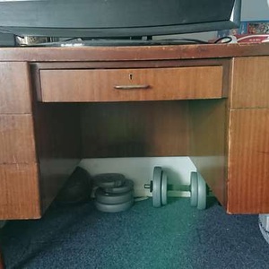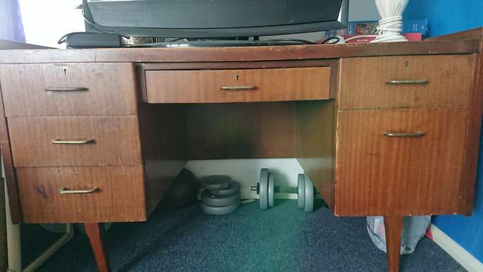 This is a solid wood desk, I'm only getting rid of due to redecoration. It will need a little TLC, as it has some paint marks on it, and is scuffed, but with a sand-down and polish it will look lovely again. It is upstairs at the moment, and will need its legs removed to get downstairs! So please note that you will have to re-attach them when you get it home. Free to a good home!