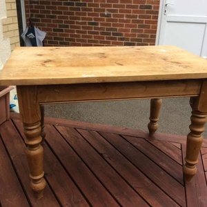 Small but solid kitchen table. In need of stripping back and renovating but a solid and sturdy piece of furniture. Collection only.