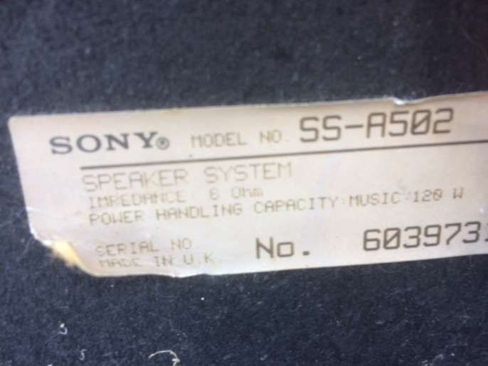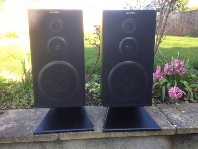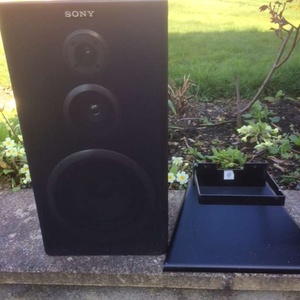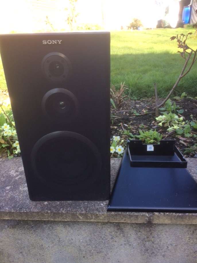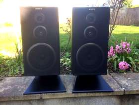 Pair of Sony Speakers and stands. 18 in x10in x7.5in good condition, nice sound. Label says up to 120w. No smoking or pet house. Collection only.