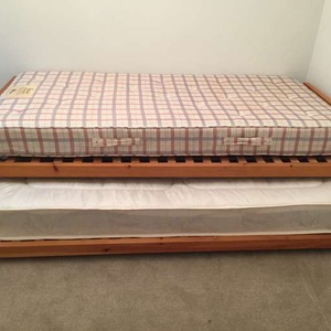 Wooden frame single bed with trundle guest bed which stacks underneath. Photo to follow