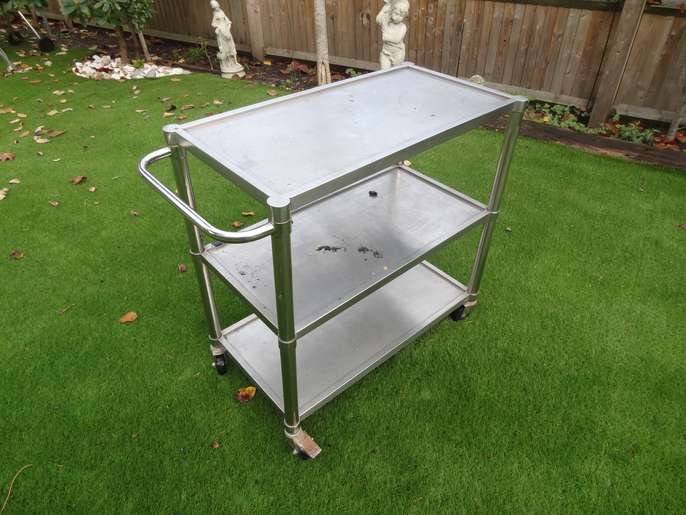 Stainless Steel Drinks / Food Trolly. Has 4 x wheels. Can be used for a multiple of uses. It's been in our garage for a couple of years, will need a dust off + Clean. Also has signs of rust on wheels., FREE for collection. First come - first served. Ottershaw, Chertsey area, KT16 XXX