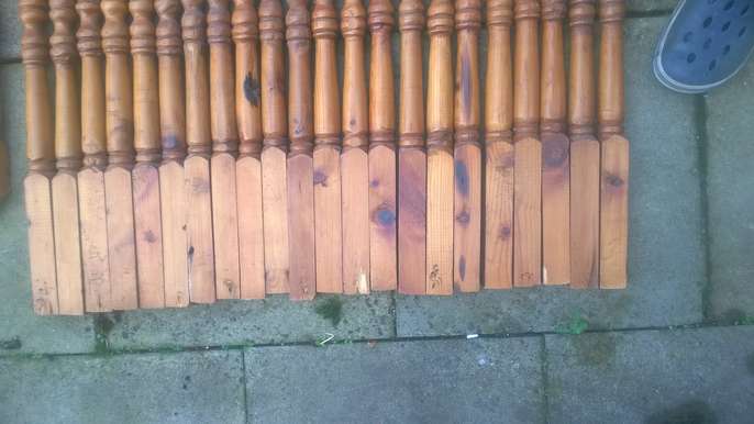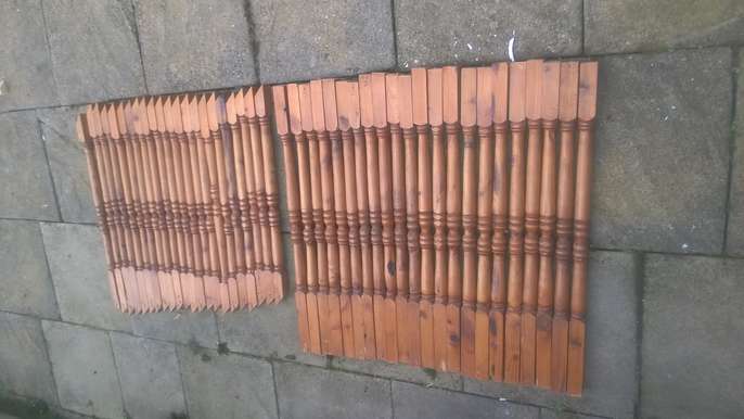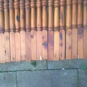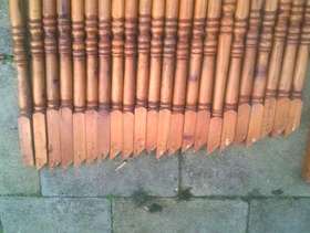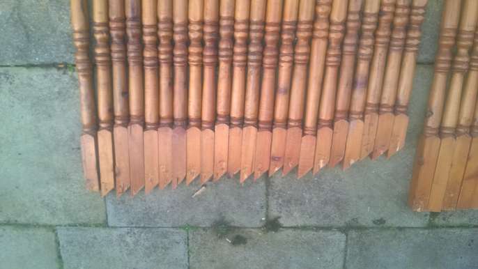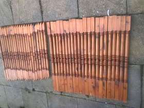 44 stair spindles 22 straight edge 83 centimetres long 22 angled edge 69.5 cm to 80 centimetres long. Pick-up only.