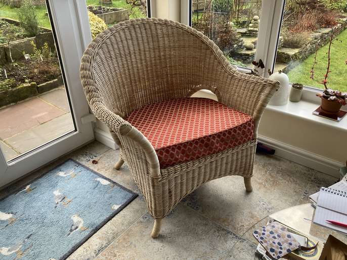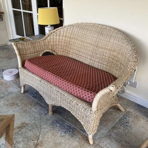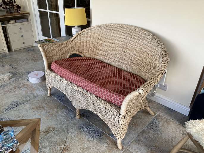 A Sun Room/Conservatory wicker sofa and armchair with upholstered foam seat cushions in generally sound condition. Give us a call on 07713980294