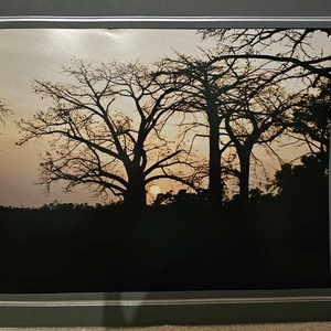 Large photo taken of a Gambian sunrise through the trees. Framed in a cardboard placement so you place in your own frame. 35.5cm wide x 28cm tall