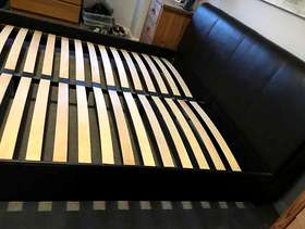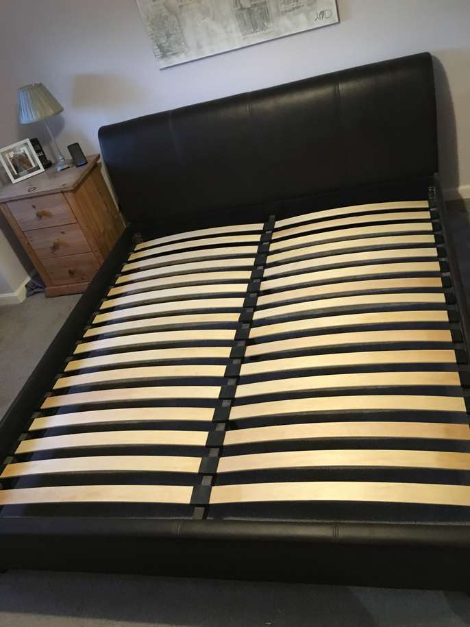 Dark brown leather bed frame Good quality-was £800 when new. Dimensions W 187cm L230cm base H 32cm Would need to be uplifted