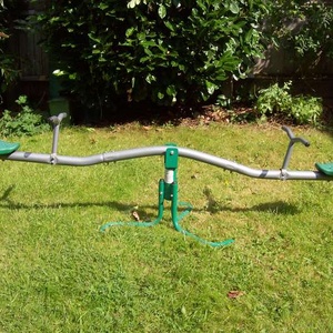 This Swinging Seesaw is designed for 3 to 8 years old. Included are three pegs to put the seesaw into a lawn for safety.