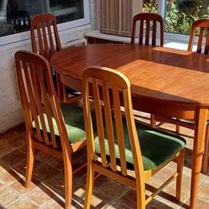 Teak dining table and 5 matching chairs. Table in good condition. Chairs frames are also in good condition but cushions need attention.