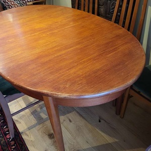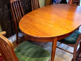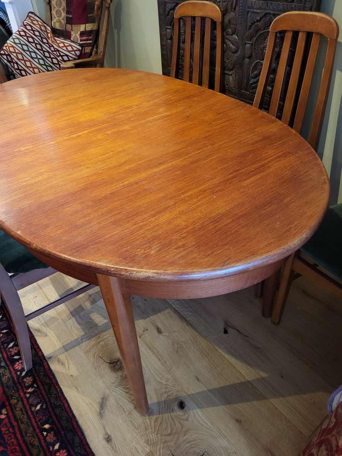1960's solid wood extending table and 5 chairs. Well used but sound condition. 1.5 m closed, 2m extended. Legs are not removable. Collect from Basingstoke.