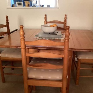 Pine table and 4 chairs. Two of the chairs need some DIY attention. Both ends of the table can be dropped to make a smaller table. For collection only