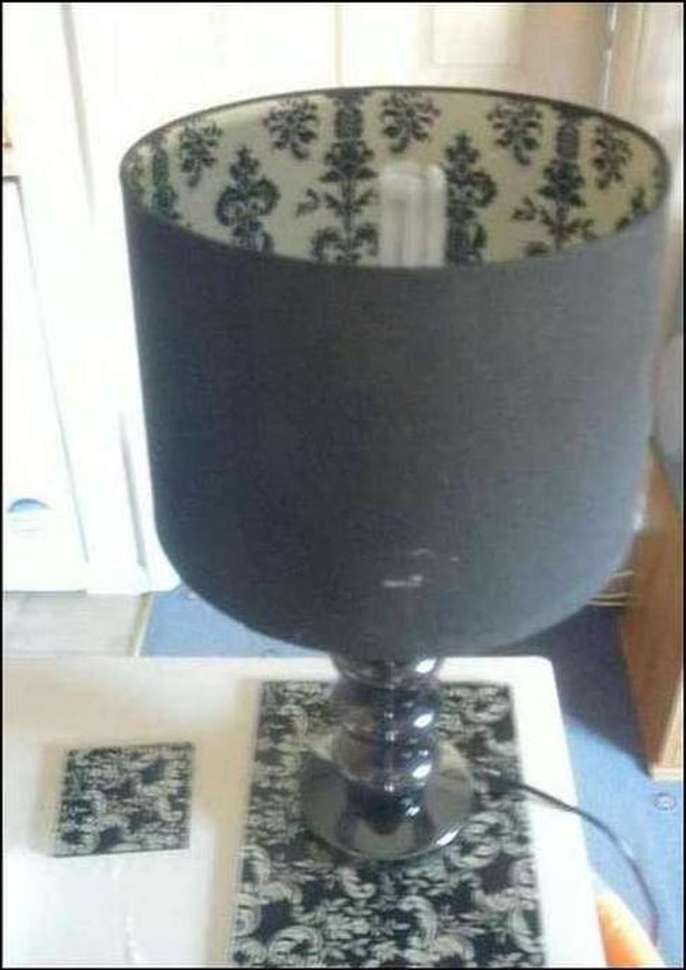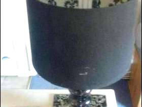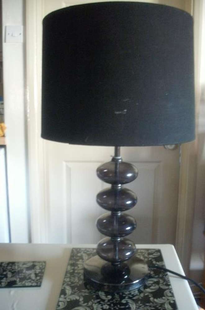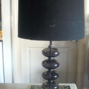 A black patterned lampshade with glass bubble effect stand, with an art deco design inside the shade. Colour: Black Diameter: 48cm/19in tall 27cm/10.5in circumference (shade) Collect, or deliver local only.