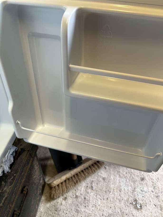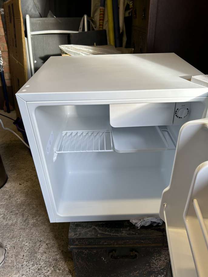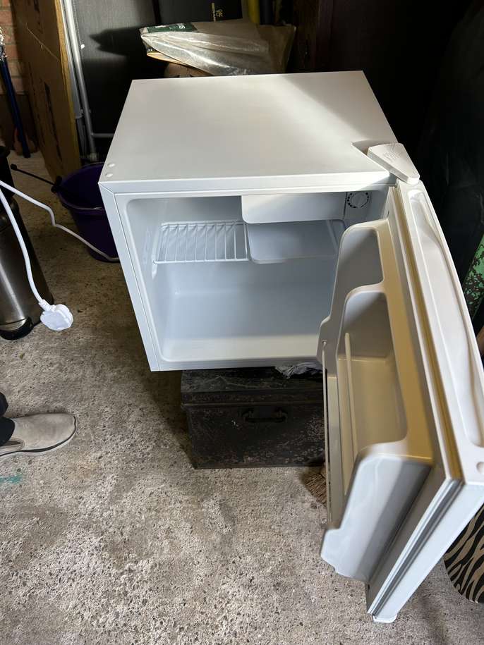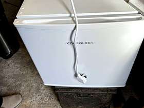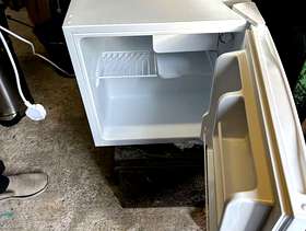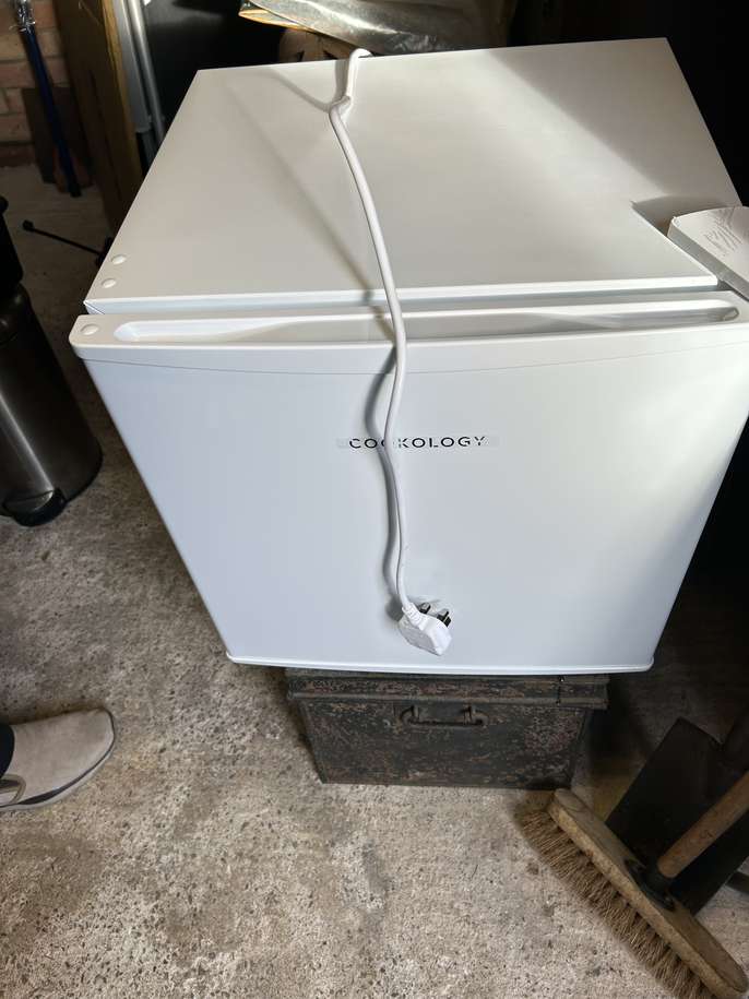 Cookology white table top/garage/den fridge with small ice compartment. Only 2 months old, used for a few weeks, in perfect working order. Measures 19” wide, 18” deep, 18” high.