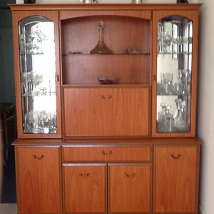 Dresser and cocktail cabinet 152w x 42d x 178h. Two glass fronted cupboards with lighting, pull down drinks storage, cupboards and drawers under. No longer required due to house move but in excellent condition