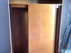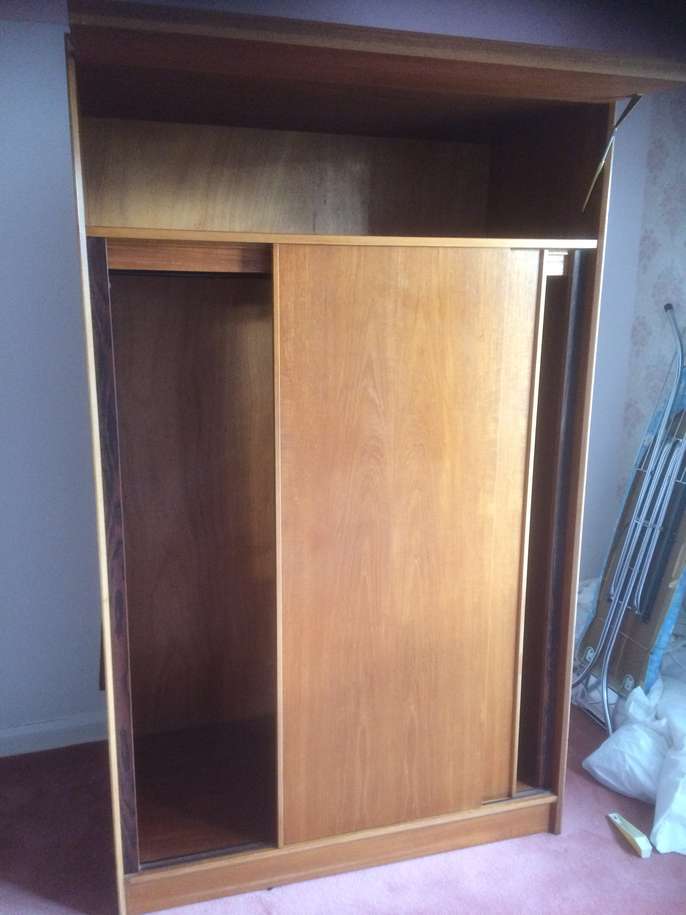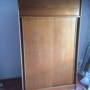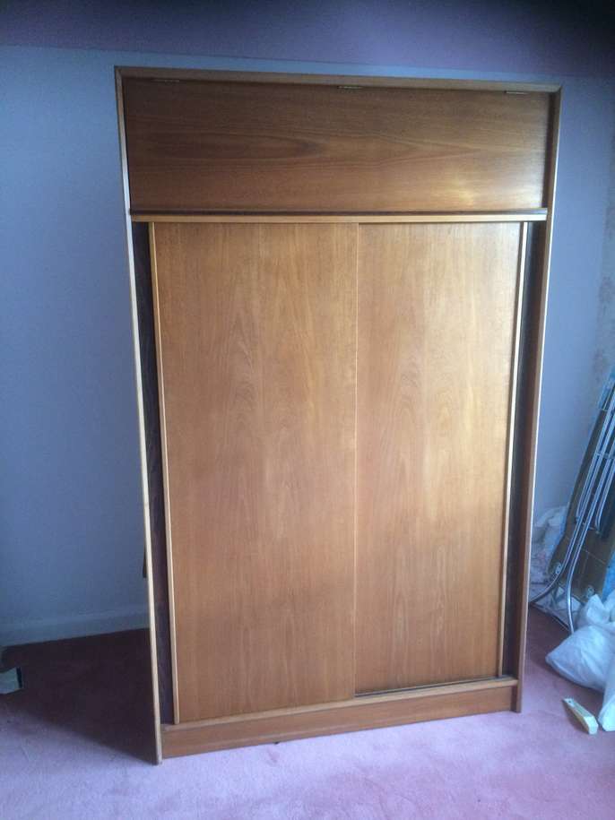 Large teak hanging wardrobe with overhead compartment. Size: 4' wide 2' 6" deep 6' tall