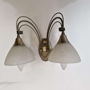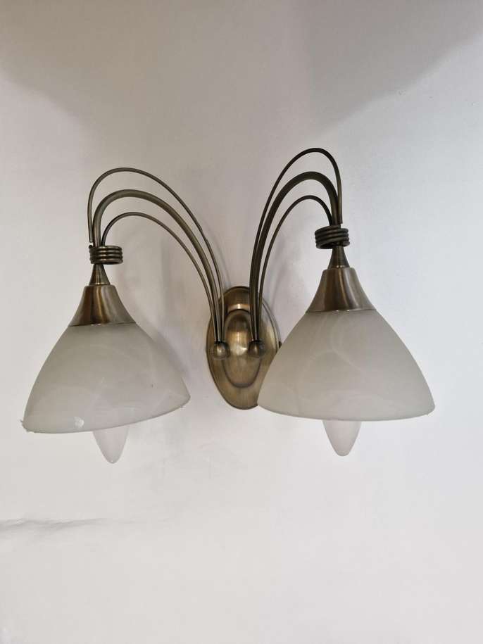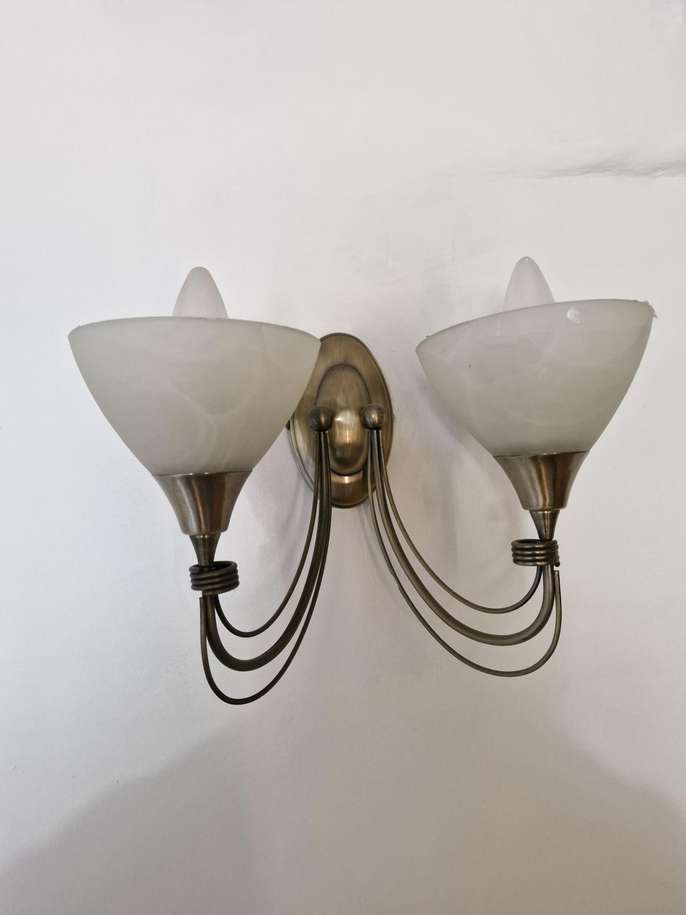 Three double wall lights This item is in St. Neots GB All the details Three double wall lights with antique brass finish and glass lampshades. Category Home & Garden Request This Item Ask a Question Post Message