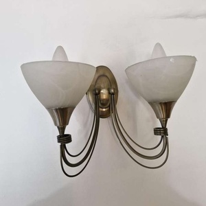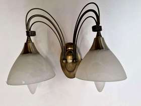 Three antique brass double wall lights with opaque glass lampshades offered free for collection