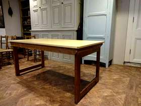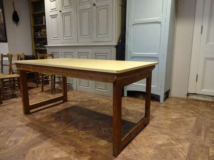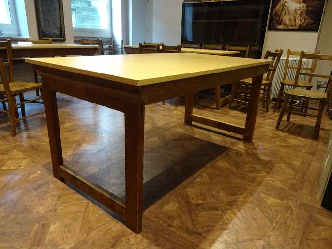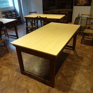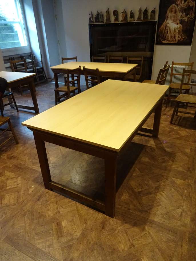 Three folding tables with wooden legs and beech effect top. Width = 80cm Length = 150cm Height = 70cm Easy to store and perfect for use in a classroom or community setting. Seat 6-8 people around each table comfortably.