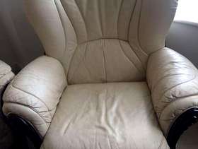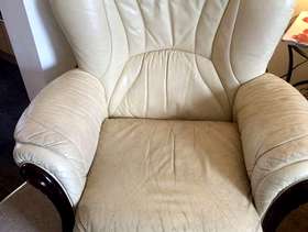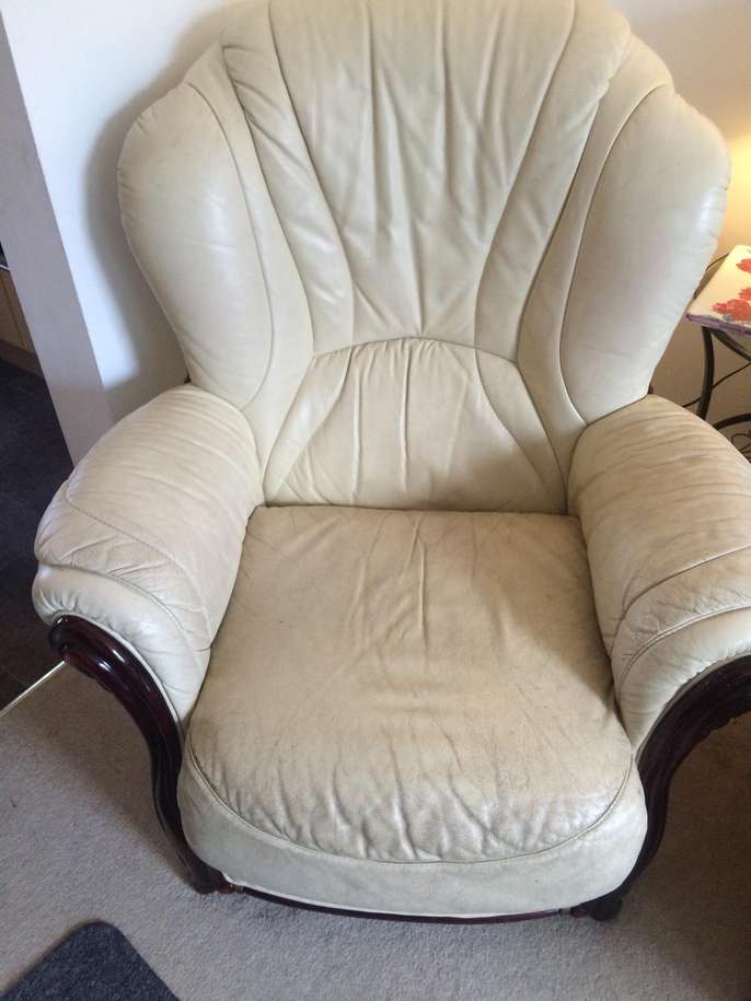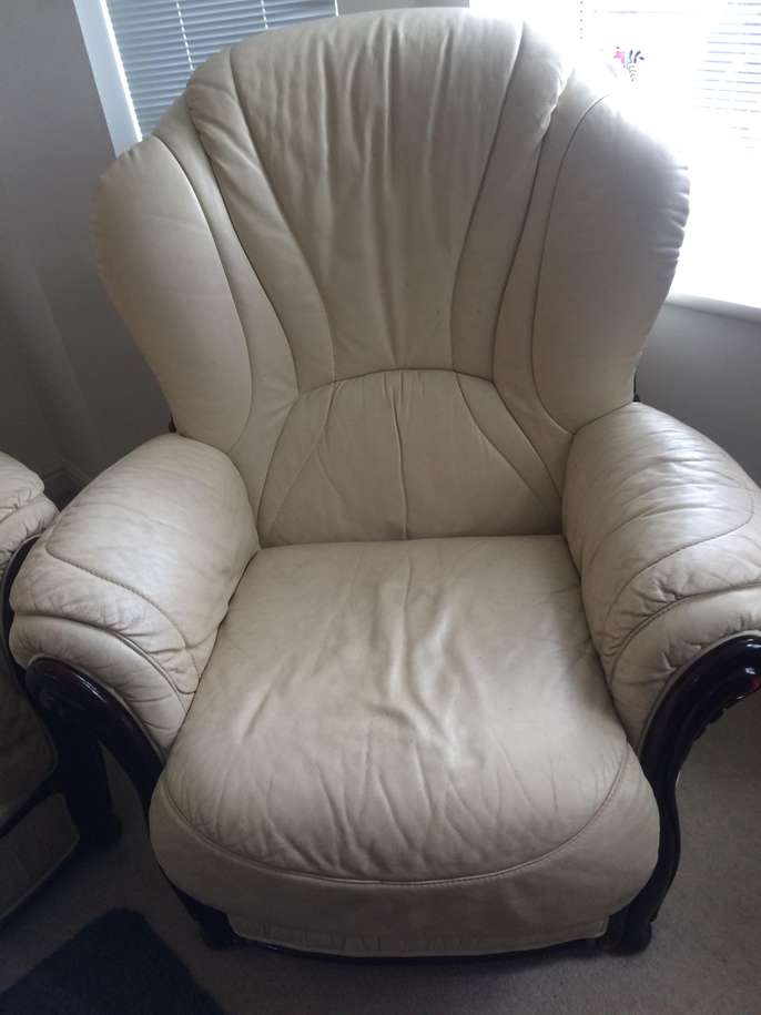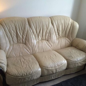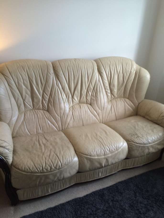Beige leather 3 seater and 2 arm chairs ok condition a few marks on seats but very comfortable. Free collection only