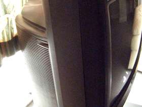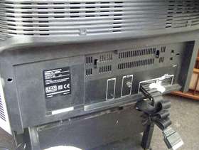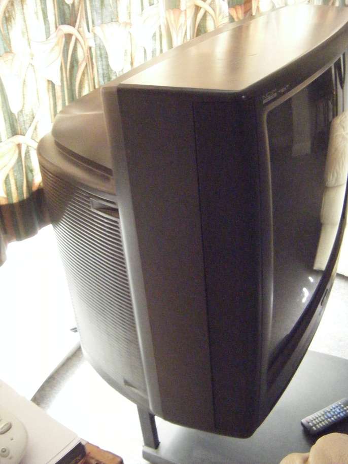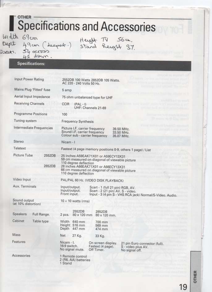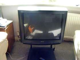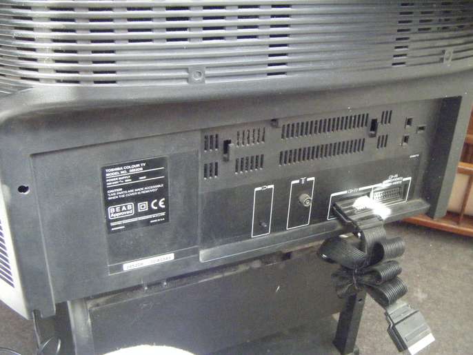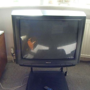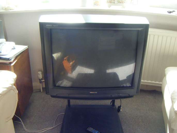 Old Toshiba TV in good working orderwith good picture. Comes complete with stand and original handbook. Screen 54cm x37cm. Cabinet 69cm wide x 49cm at deepest point. (Sides graduate to back.) Cabinetl height of TV 56cm. Height of stand 37cm.