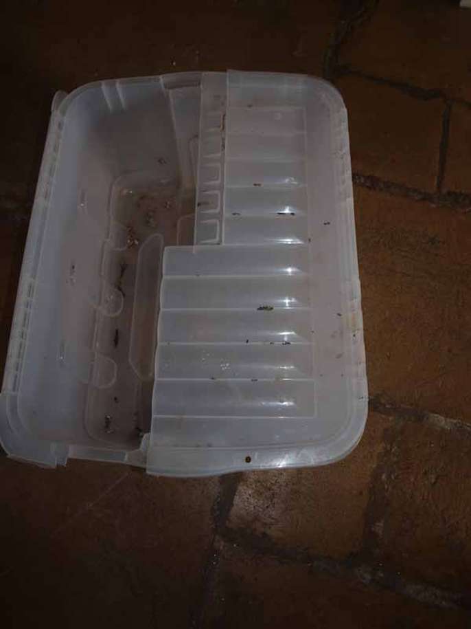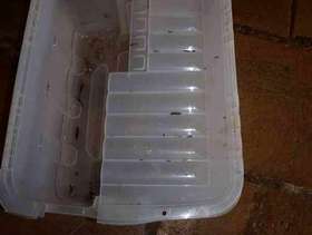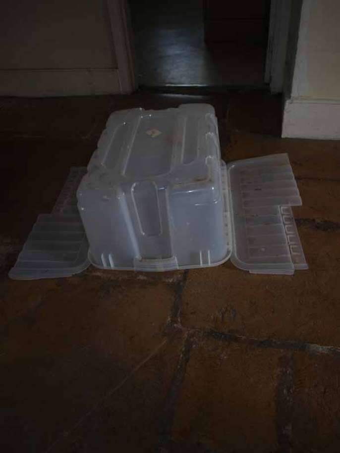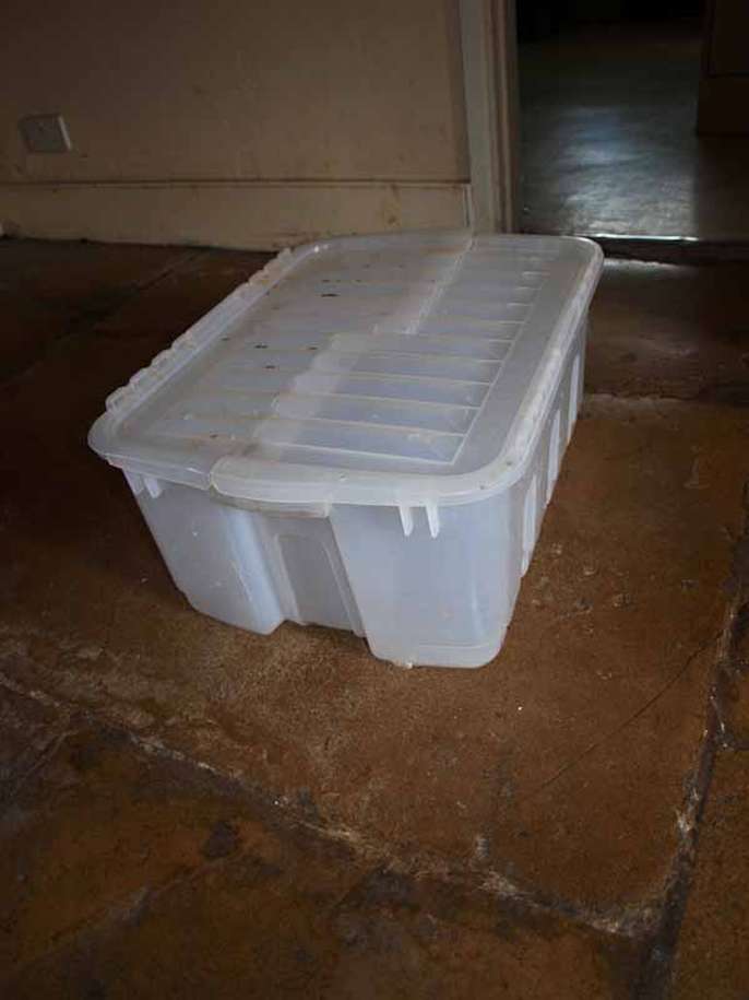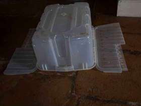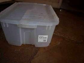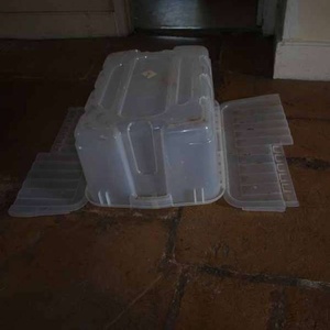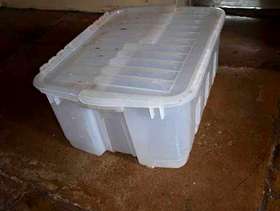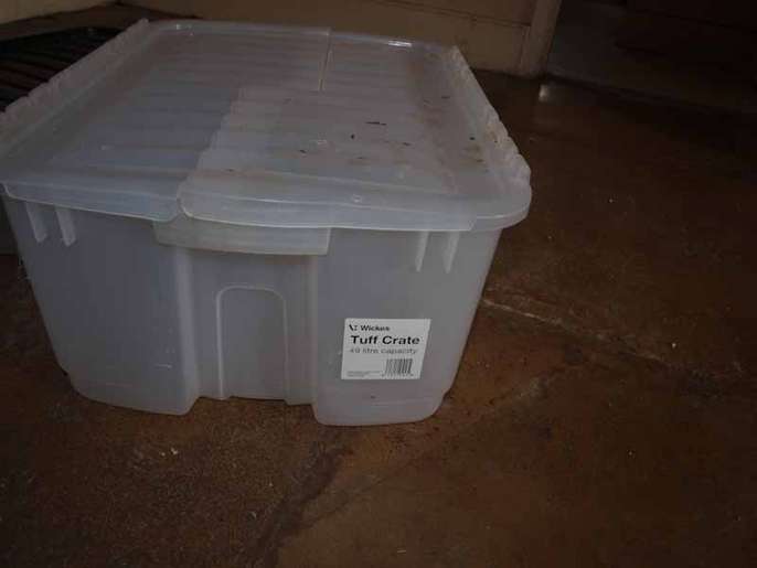 'Wickes Tuff Crate", 49L capacity 2-part interlocking hinged lid 270mm high x 580mm long x 420mm wide.