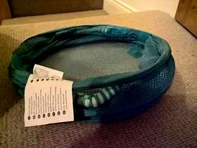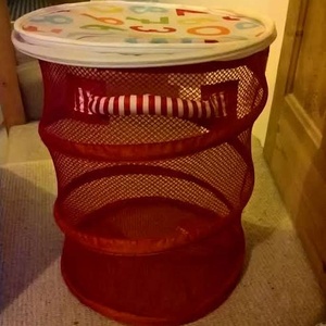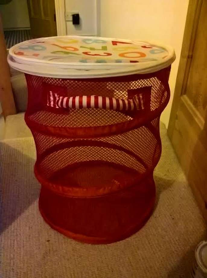 Two lightweight toy baskets - one blue, one red - with alphabet pattern lids. Easy to carry, lightweight and can be packed down very easily when not in use. Ideal for soft toys. Available separately or together.
