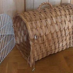 Traditional wicker cat cage with metal door.
