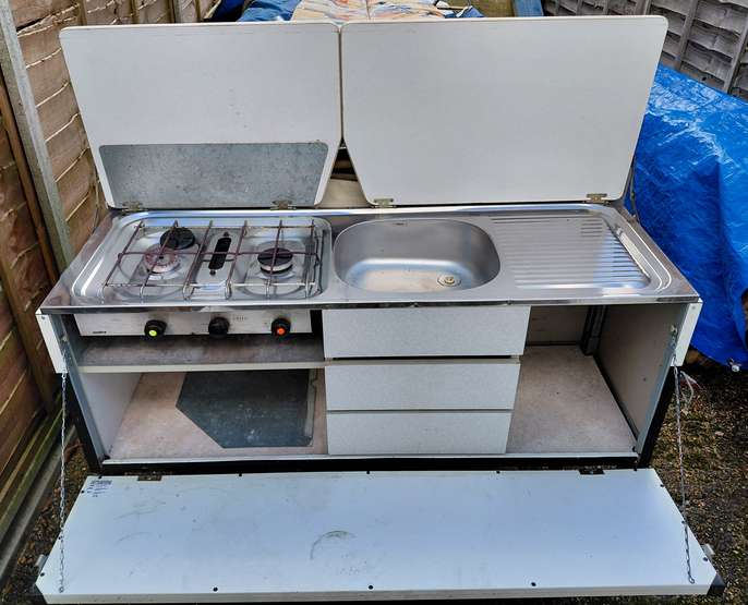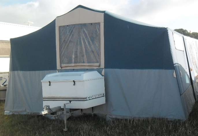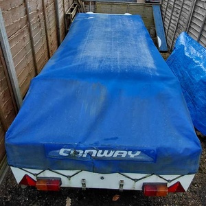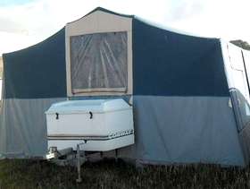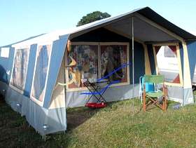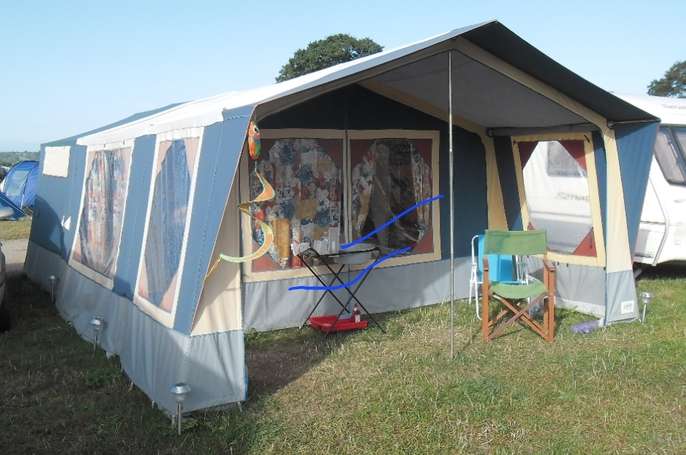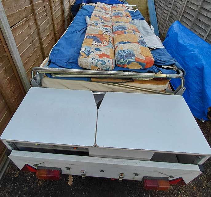 1999 Coleman TrailerTent with top box storage 8 berth with 2 x pup tents Blue and mustard yellow colour scheme Trailer size is 3.8m long by 2.5m wide Approx 6m x 4m including trailer section and awnings when fully pitched Flexible awning configurations with inner roof linings and curtains Plenty of spare guys and pegs 2 good road tyres and a spare wheel Hitch lock and jockey wheel Instruction manual / erecting instructions May need some new tent rubbers - usual upkeep items - no tears and has been regularly with no issues over the years having been tested by the elements at times. Time to move on and let someone have some fun and make memories. See photos Happy to deliver locally within 5 mile radius