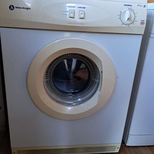 White Knight tumble dryer, unused for a few years. Seems to be working, but did have a minor leak when last used and will need cleaning.