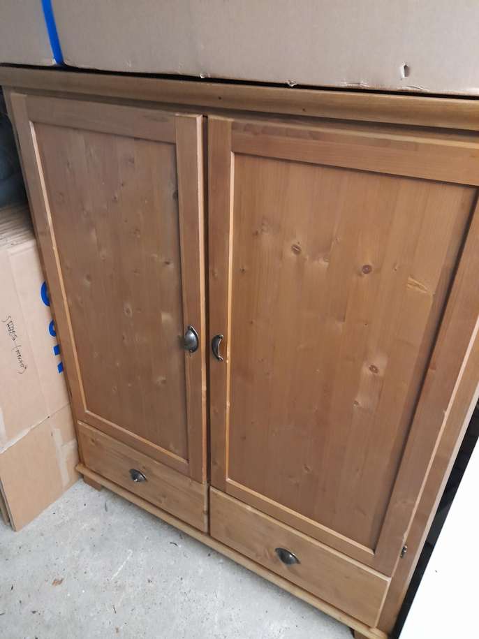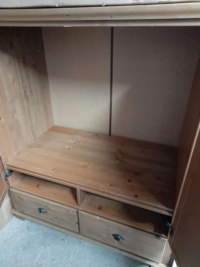 Wooden TV cabinet, two drawers at the bottom and shelving for DVD, TV boxes etc Size H 53 x W 45 x D25 inches Maximum size TV that fits in is 40 inches Good condition, doesn't fit in our new house Collect only - Barton-under-Needwood