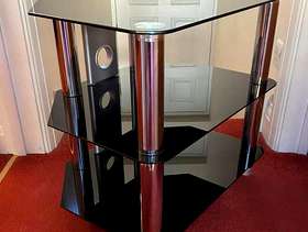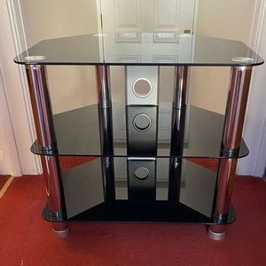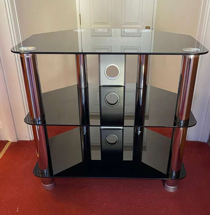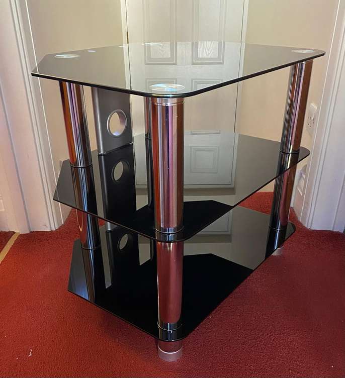 Toughened smoked glass TV stand with silver coloured chrome legs and 3 shelves. Excellent condition.