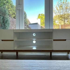 TV Unit, used. White melamine with oak legs and draw trim. 180cm wide 40cm Deep. 4 Drawers & 2 Shelves.