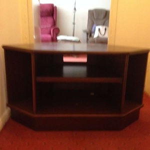 Wooden tv unit, has sliding shelf for DVDs player, sky box etc