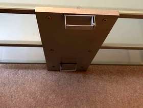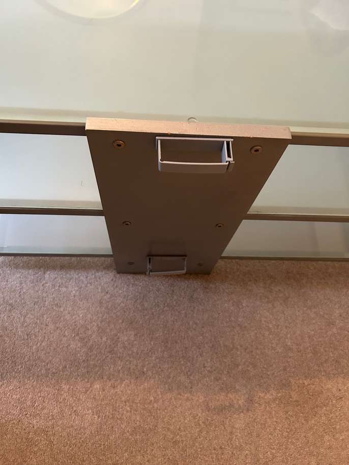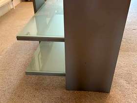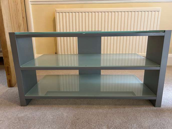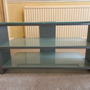 This is a strong, metal and glazed glass TV and or HiFi Unit - three 'shelves' and cable tidies on the back. Dimensions: Width - 87cm Depth - 44cm Height - 46cm Unit is in Hampton, TW12